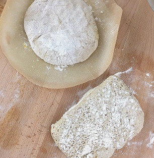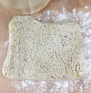 Bekleme süresinde hamur oldukça güzel kabarmıştı. Hafif unladığım tezgaha hamuru çok da zedelemeden, ezip büzmeden aldım. Altının ve üzerinin bol unlanması önemli. Ortası olduğuna karar verdiğim yerden hamuru ikiye ayırdım. Hamur soğuk olduğu için çalışılması son derece kolay. Oda sıcaklığına gelmesini beklemeyin!