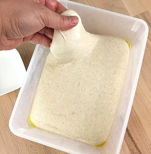 2. Resimde hamurun ertesi günki görüntüsü var. Yayılmış ve hafif kabarmıştı.Hamuru elimi ıslatarak tekrar bir tur katladım ve hiç bekletmeden tekrar dolaba kaldırdım.