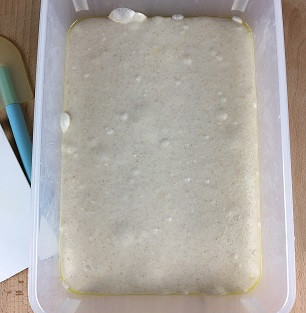 Hamuru alta doğru kat vererek, elimle esnetip hafif gererek 4 yanından katladım. Bu işlemi 3 kere 15 dakika aralıkla yaptım. Daha uzun süre beklemedim çünkü hamurun çok yayılmadan içeri hava alması gerekiyordu. 3. Katlamadan sonra hamuru oda sıcaklığında üzeri örtülü beklemeye aldım. Bu esnada kabarıp olgunlaştı. Bu süre yaklaşık 4-5 saat.