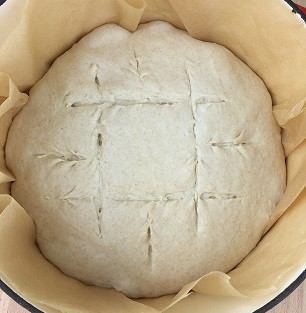 Fırını 220 derecede önceden ısıttım. Kabaran hamuruma çizikler attım. Tencerenin kapağını kapatıp, soğuk tencereyi sıcak fırına verdim. 40 Dakika fırını ve kapağı açmadan, ısıyı da sabit tutarak pişirdim. Sonra kapağı açıp yaklaşık 10-15 dakika da üzerinin kızarması için beklettim, ısıyı biraz yükseltmek şartı ile.
